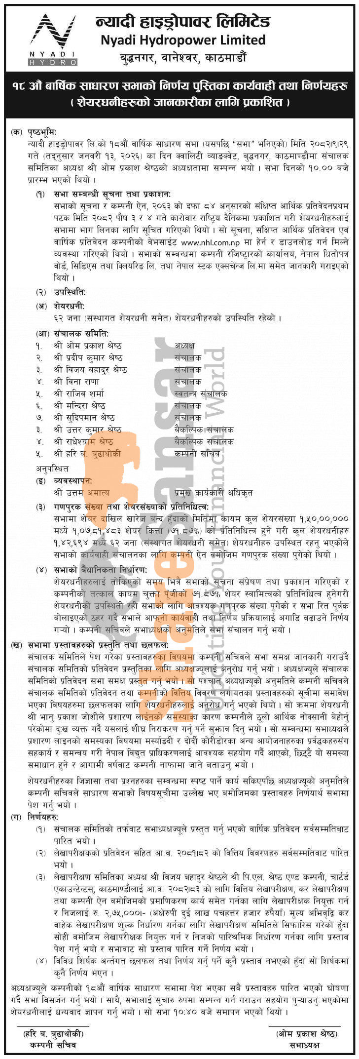 Nyadi Hydropower Limited has published the minutes of its 18th AGM.