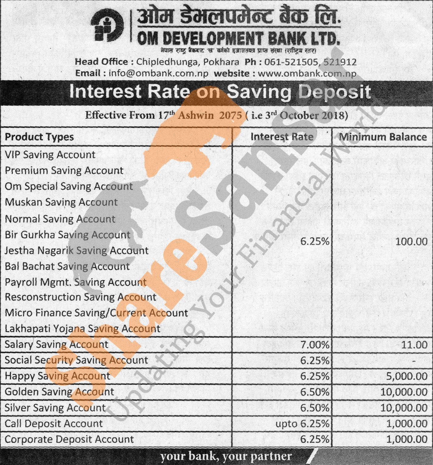 Om Development Bank Limited has published a notice regarding new interest rate and its effective from 17th Ashwin, 2075.