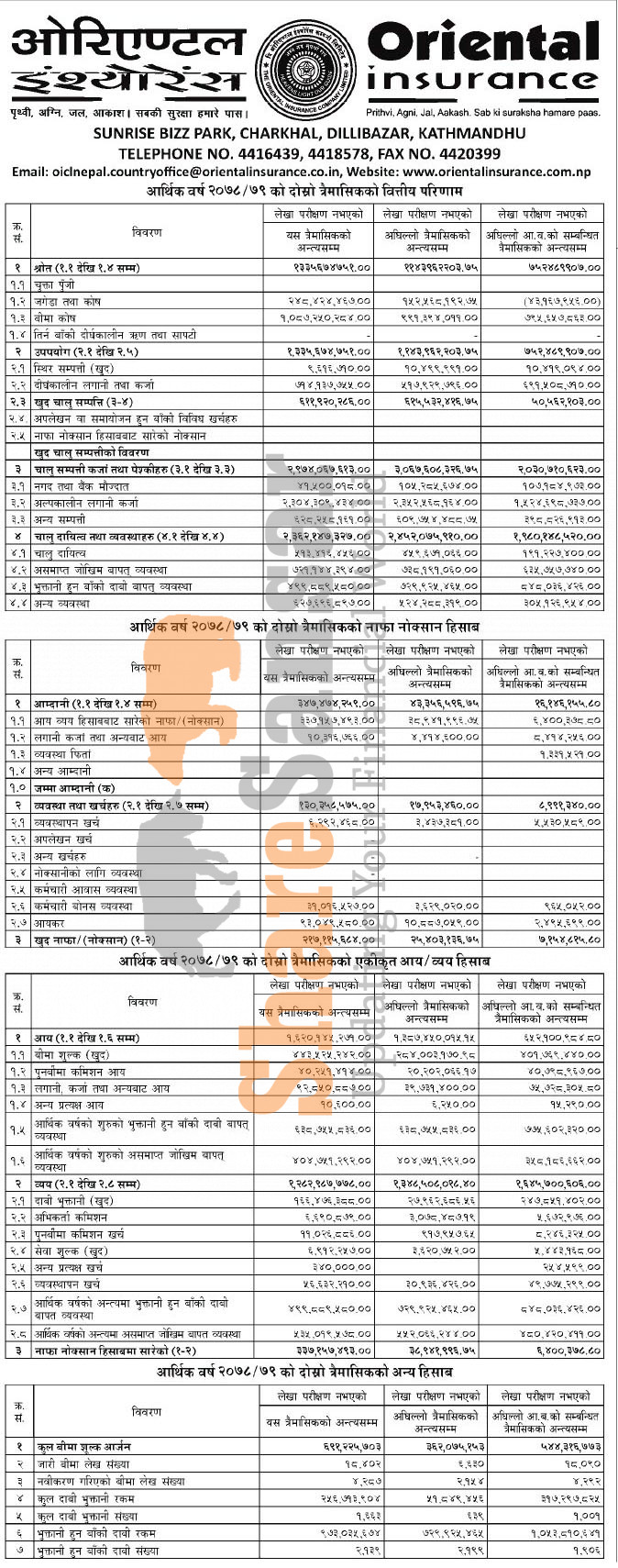 Oriental Insurance Company Limited has posted a net profit of Rs 217.11 million during the 2nd quarter of the fiscal year 2078/79.