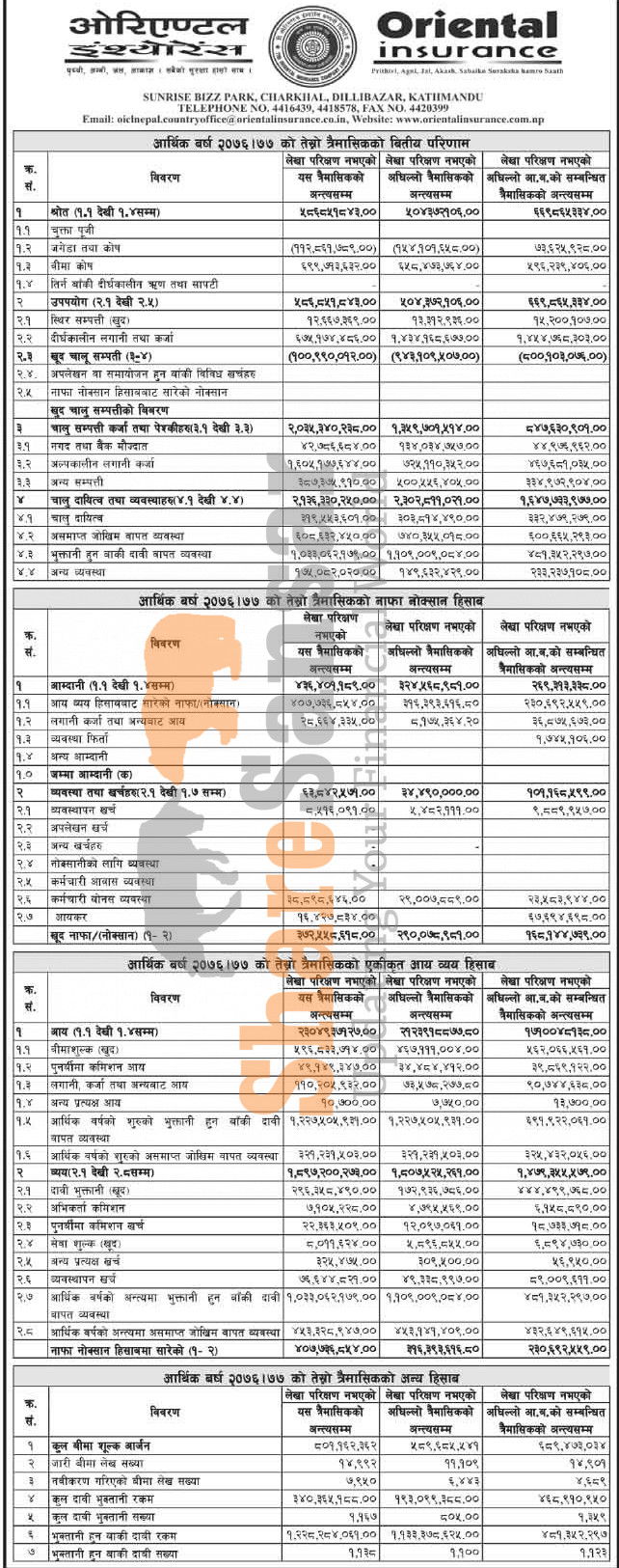 Oriental Insurance Company Limited has posted a net profit of Rs 372.55 million during the 3rd quarter of the fiscal year 2076/77.