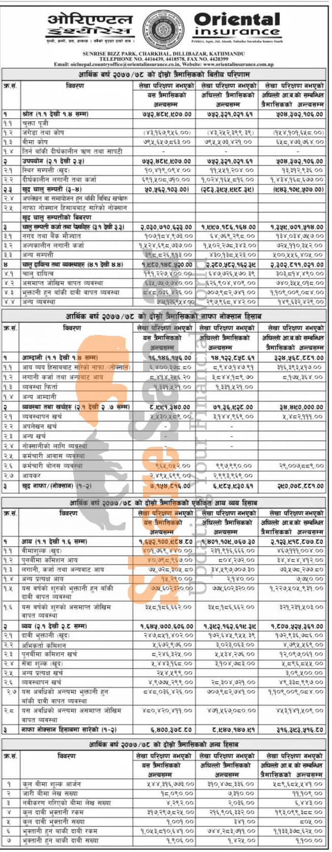 Oriental Insurance Company Limited has posted a net profit of Rs 7.15 million during the 2nd quarter of the fiscal year 2077/78.