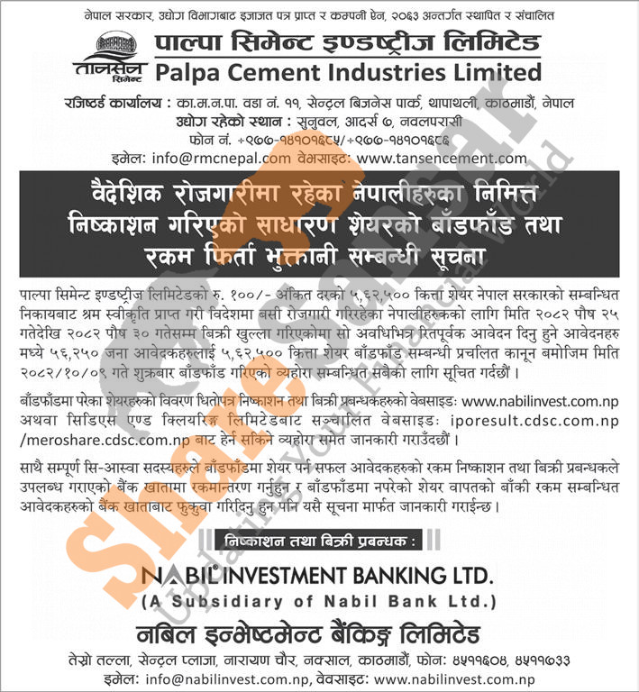 Palpa Cements Industries Limited has allotted its 5,62,500 units IPO Shares to Foreign Nepalese Employees on 9th Magh, 2082.
