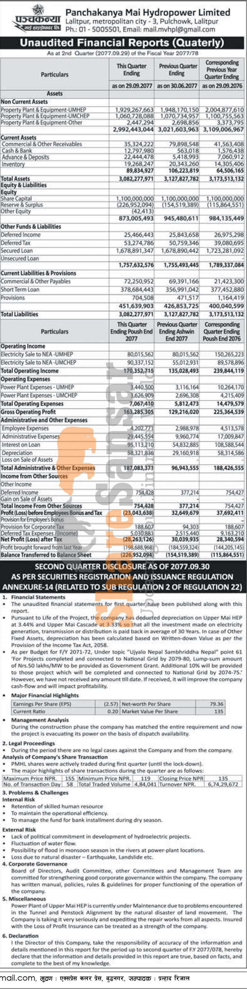 Panchakanya Mai Hydropower Limited has posted a net loss of 28.26 million and published its 2nd Quarter Company Analysis of the fiscal year 2077/78.