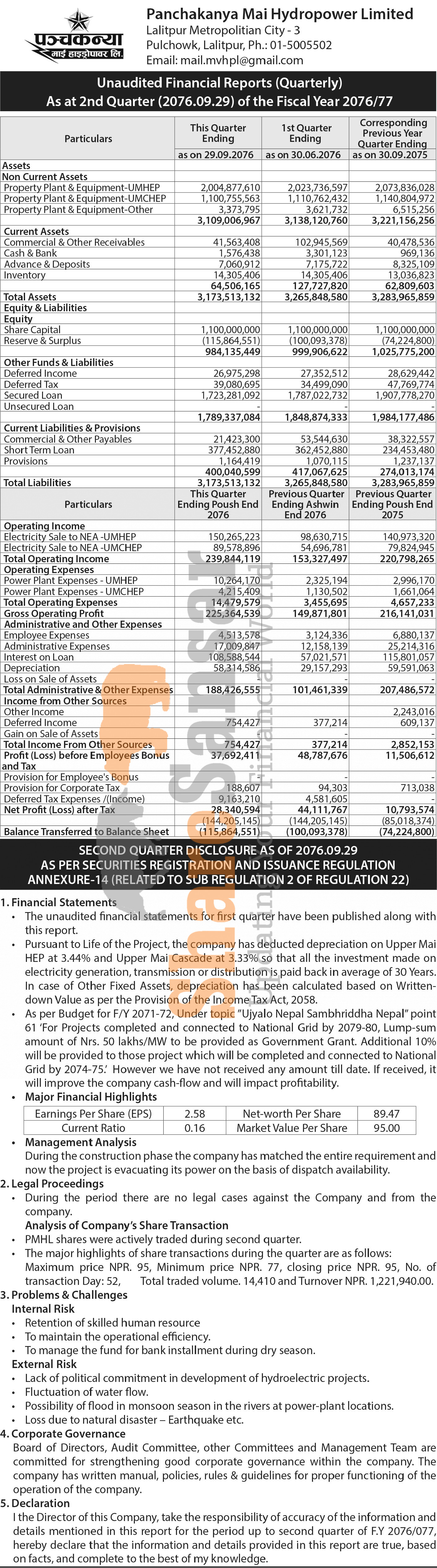 Panchakanya Mai Hydropower Limited has posted a net profit of Rs 28.34 million and published its 2nd quarter company analysis of the fiscal year 2076/77.