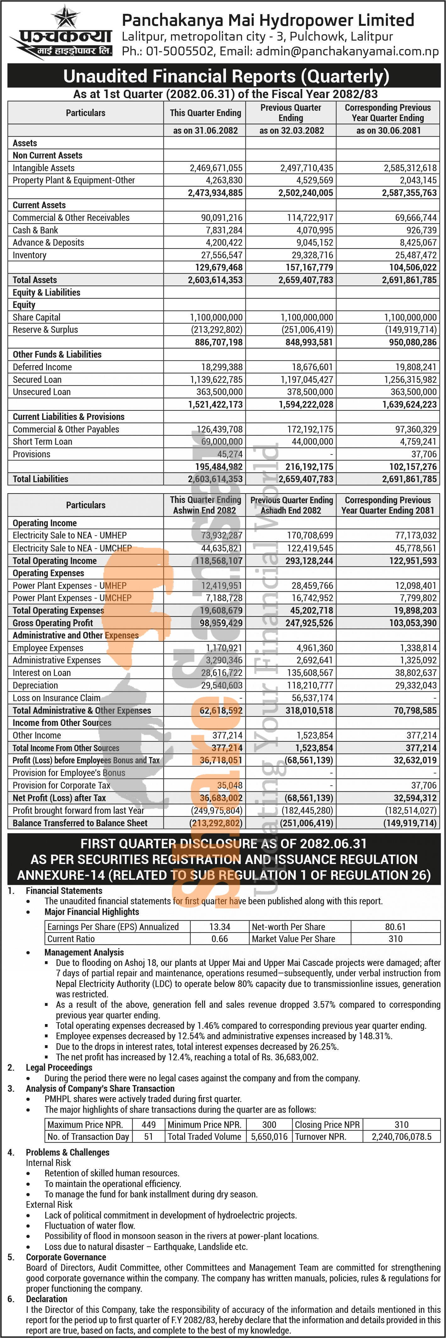 Panchakanya Mai Hydropower Limited has posted a net profit of Rs 36.68 million and published its 1st quarter company analysis of the fiscal year 2082/83.