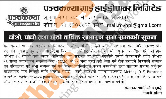 Panchakanya Mai Hydropower Limited has published a notice regarding its upcoming 4th, 5th and 6th AGM to be conducted through virtual medium.