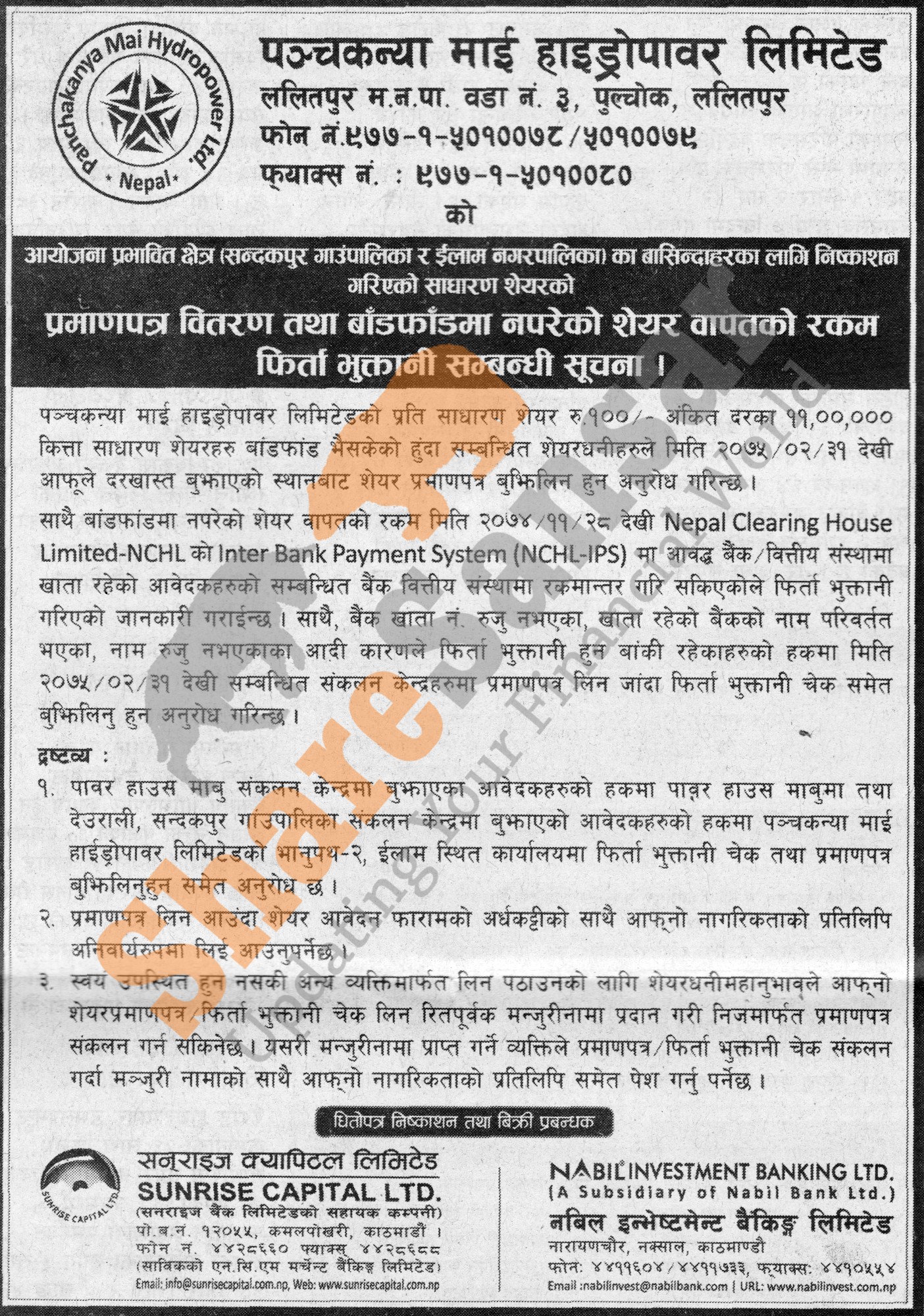 Panchakanya Mai Hydropower Limited is distributing share certificate of IPO share to the project affected local residents of Sandakpur Rural Municipality and Ilam Municipality from 31st Jestha, 2075 and refunding money to non-allottee investors from 31st Jestha, 2075.