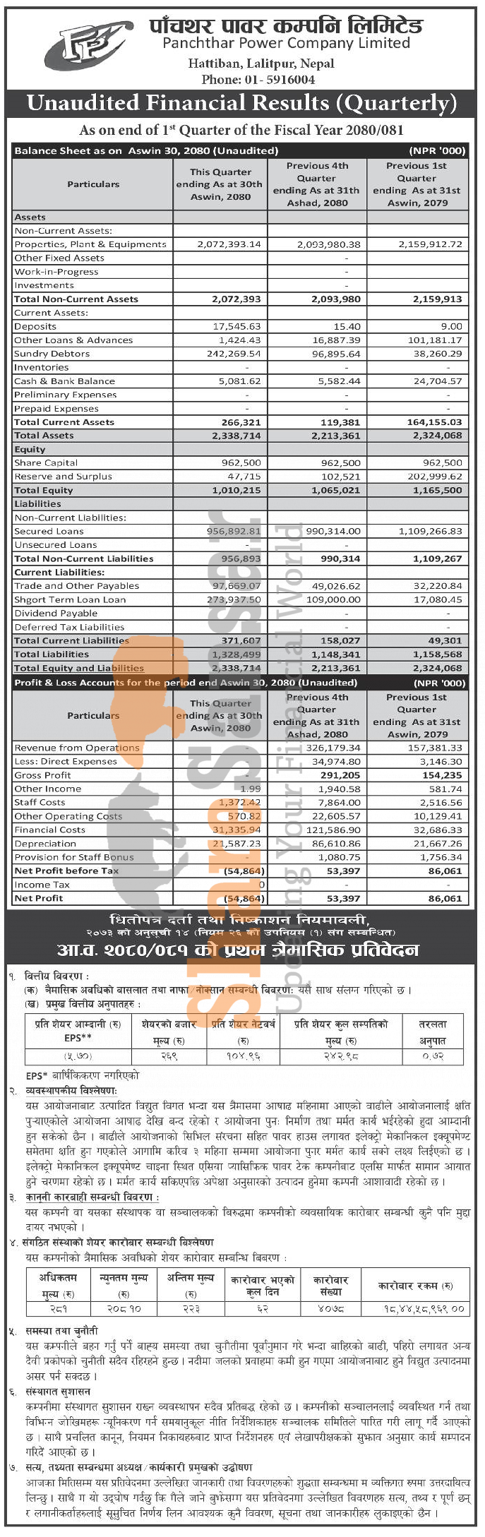 Panchthar Power Company Limited has posted a net loss of Rs 54.86 million and published its 1st quarter company analysis of the fiscal year 2080/81.