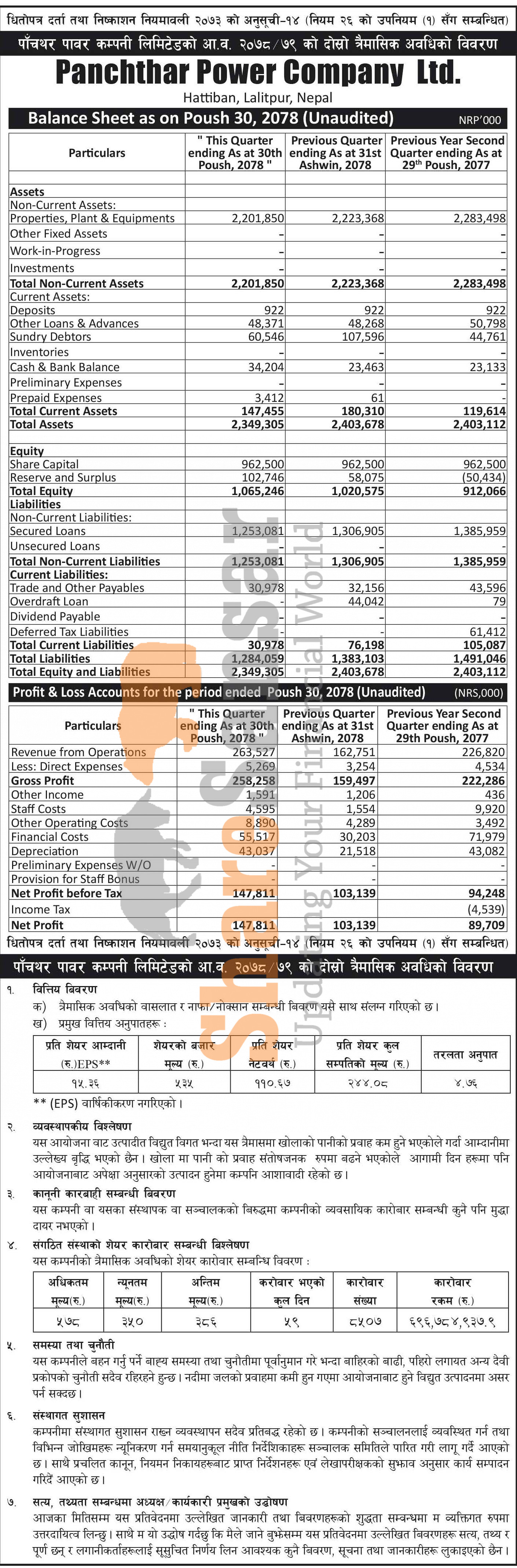 Panchthar Power Company Limited has posted a net profit of Rs 147.81 million and published its 2nd quarter company analysis of the fiscal year 2078/79.