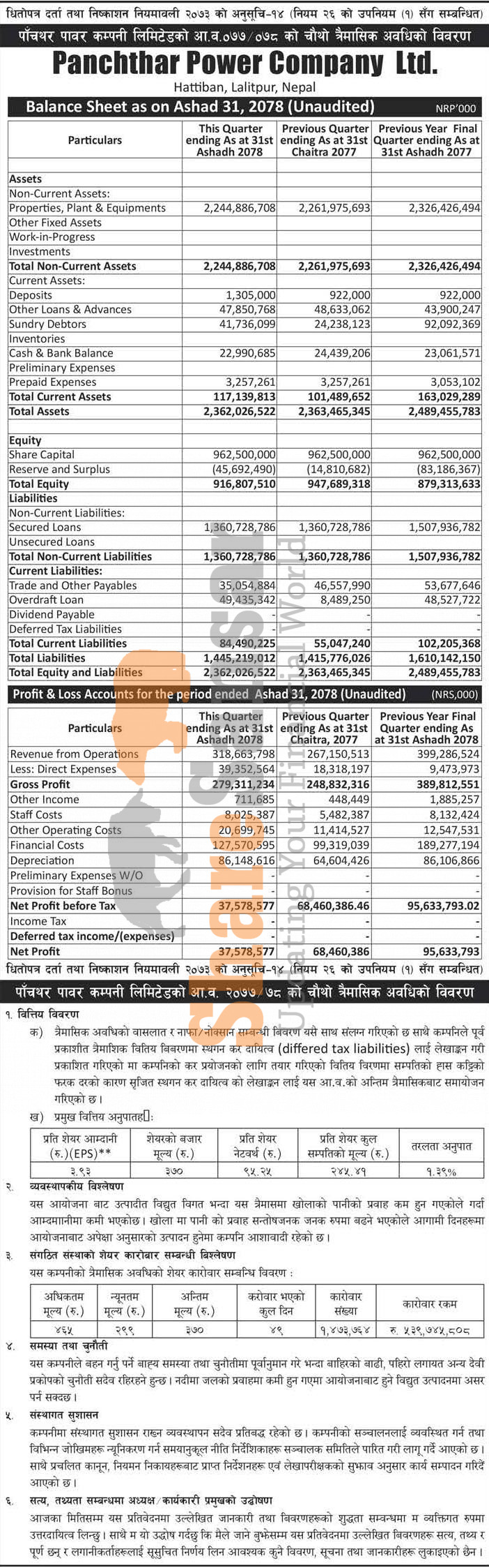 Panchthar Power Company Limited has posted a net profit of Rs 37.57 million and published its 4th quarter company analysis of the fiscal year 2077/78.