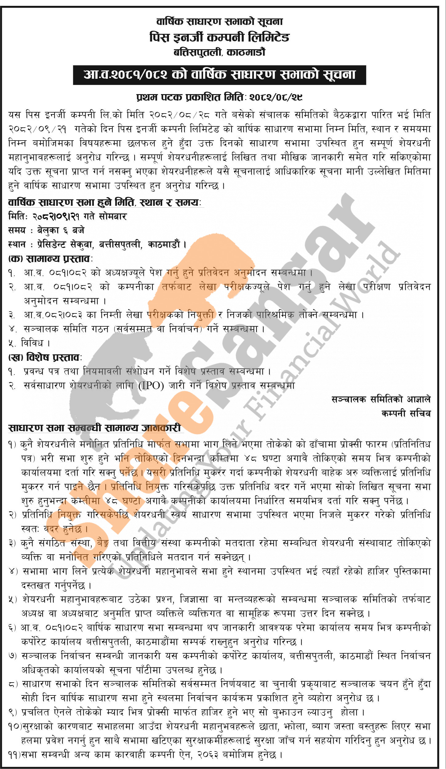 Peace Energy Company Limited has announced its AGM going to be held on 21st Poush, 2082.
