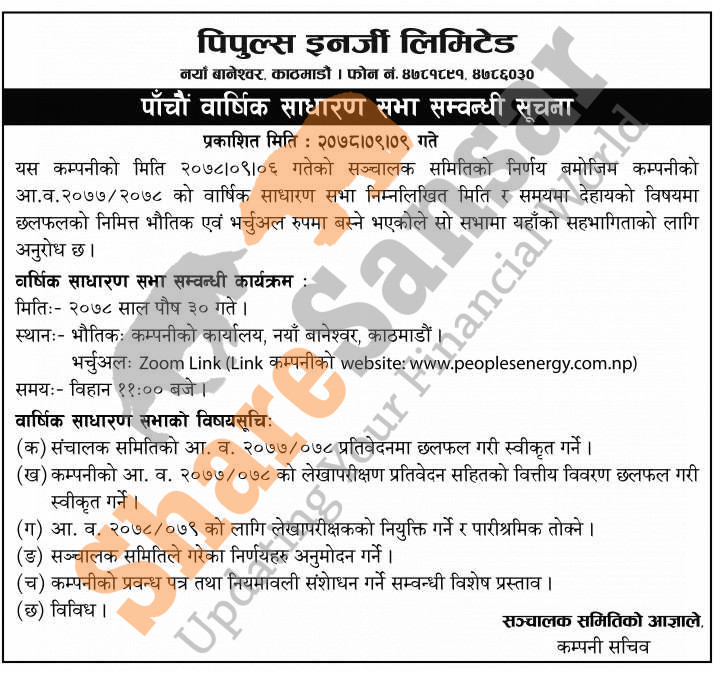 Peoples Energy Limited has announced its 5th AGM going to be held on 30th Poush, 2078.