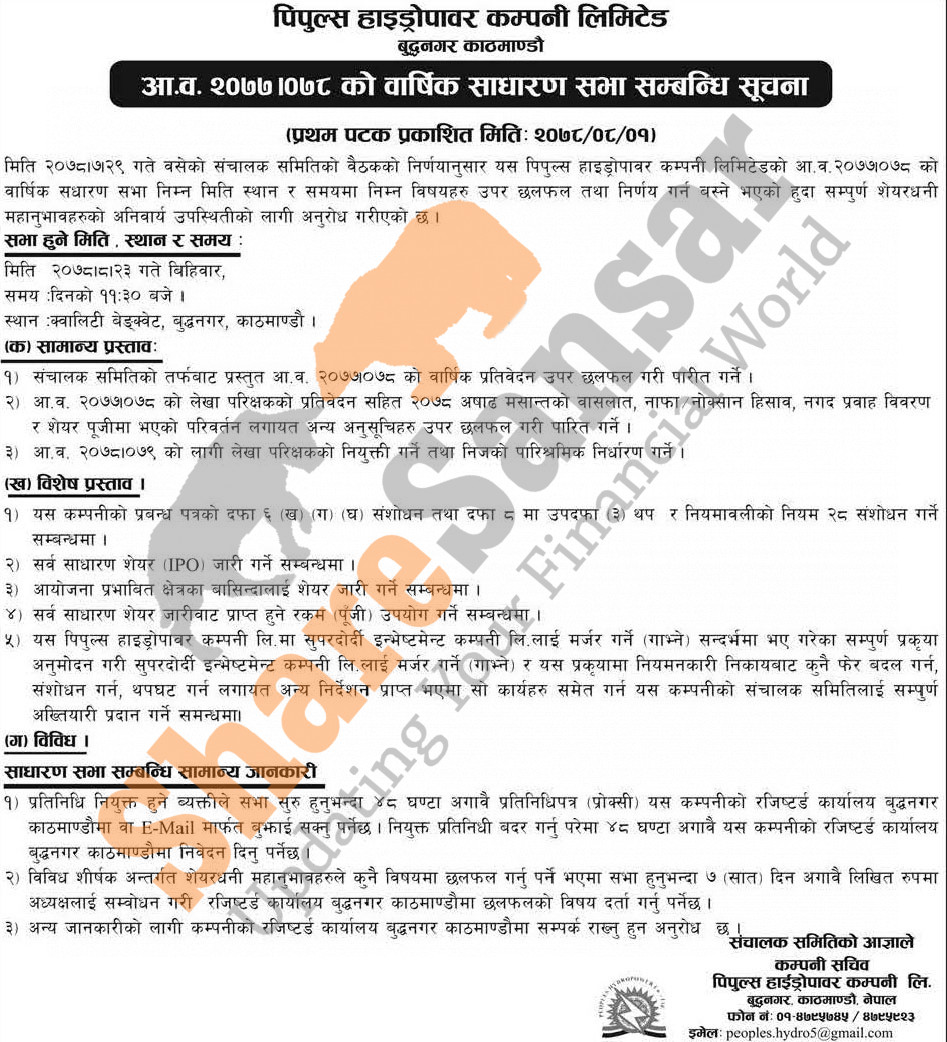 Peoples Hydropower Company Limited has announced its AGM going to be held on 23rd Mangsir, 2078.