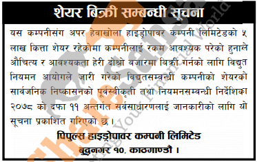 Peoples Hydropower Company Limited is selling 5,00,000 units shares of Upper Hewakhola Hydropower Company Limited in the secondary market.