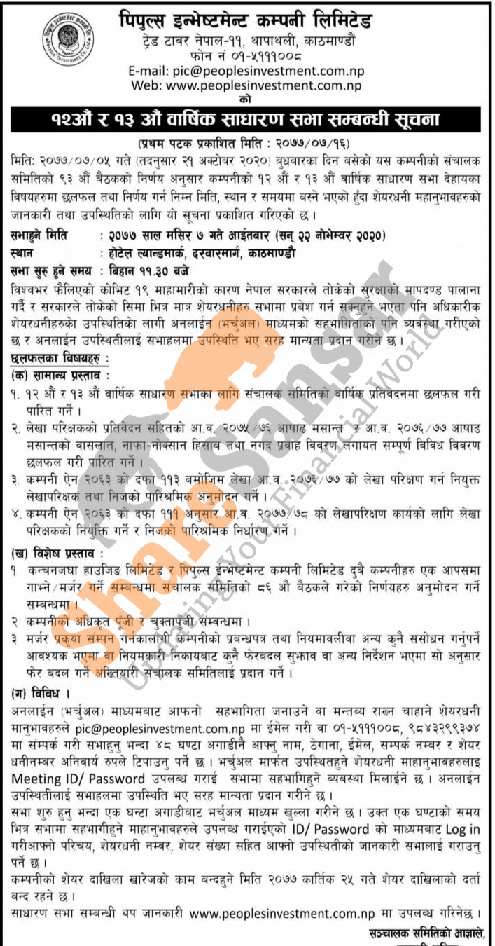 Peoples Investment Company Limited has announced its 12th and 13th Annual General Meeting going to be held on 7th Mangsir, 2077.
