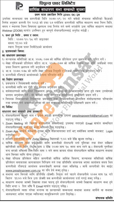 Peoples Power Limited has announced its AGM going to be held on 18th Magh, 2077.