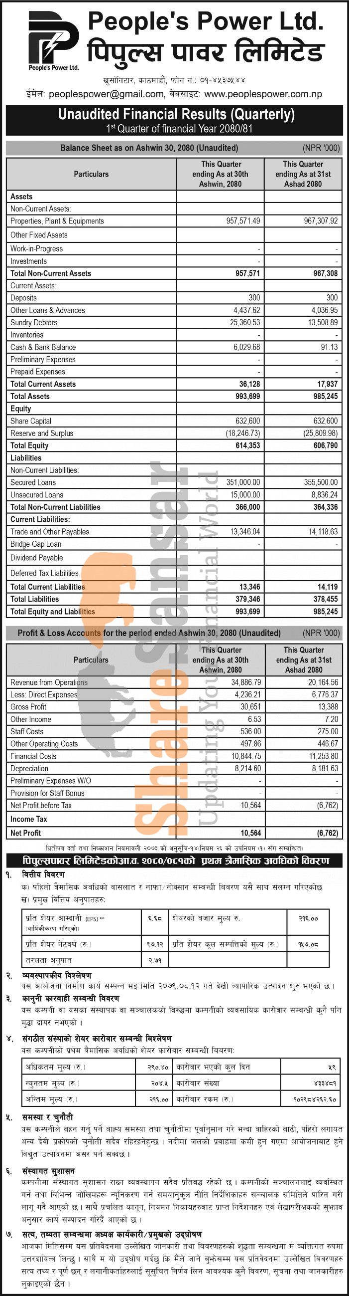 People's Power Limited has posted a net profit of Rs 10.56 million and published its 1st quarter company analysis of the fiscal year 2080/81.