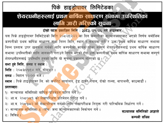 PK Hydropower Limited has announced its 1st AGM going to be held on 14th Baisakh, 2083.