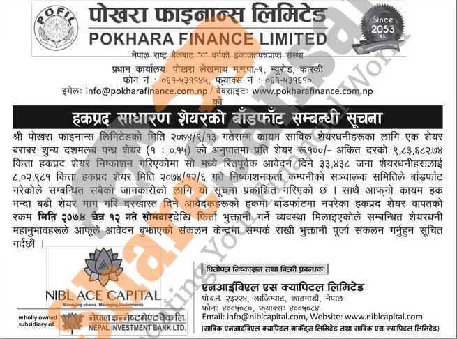 Pokhara Finance Limited has allotted its 1:0.15 ratio right shares to its shareholders on 6th Chaitra, 2074 and refunding money to the non-allottee investors from 12th Chaitra, 2074.