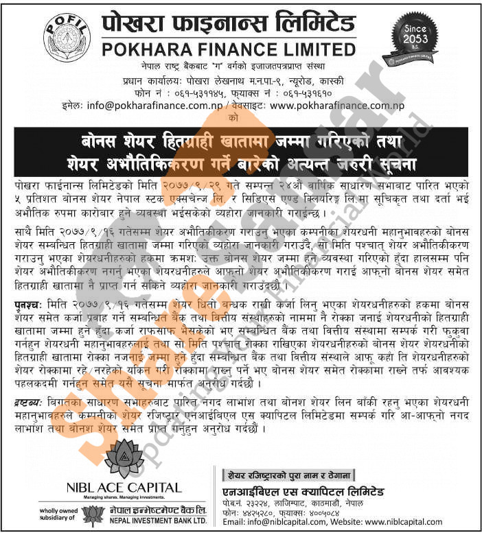 Pokhara Finance Limited has distributed 5% bonus shares directly to DEMAT accounts of its shareholders and has urged to dematerialize their shares.