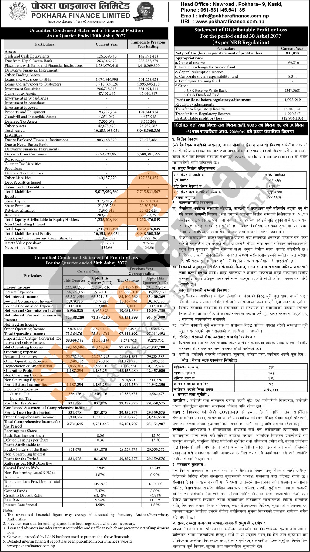 Pokhara Finance Limited has posted a net profit of Rs 0.83 million and published its 1st quarter company analysis of the fiscal year 2077/78.