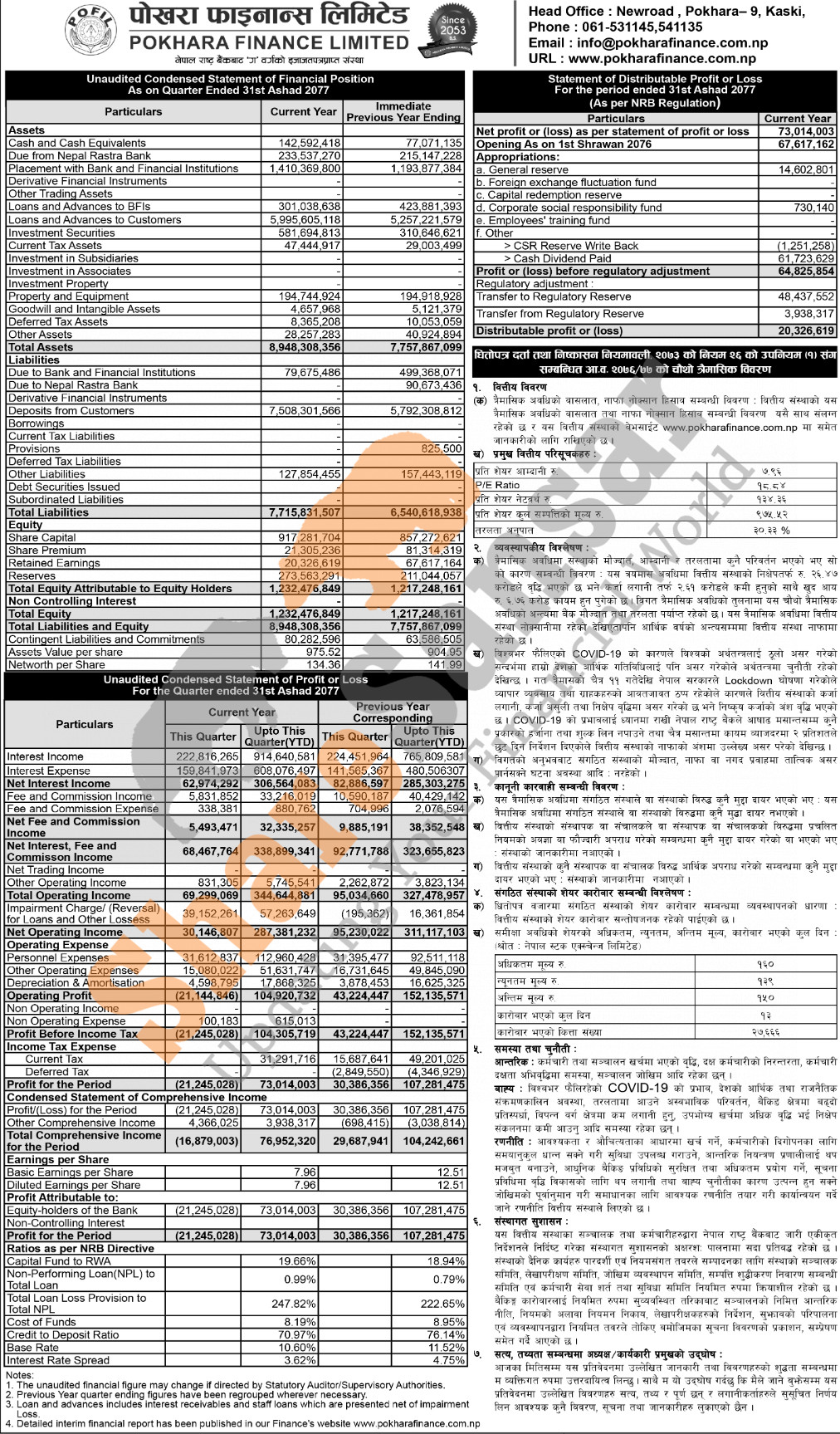 Pokhara Finance Limited has posted a net profit of Rs 73.01 million and published its 4th quarter company analysis of the fiscal year 2076/77.