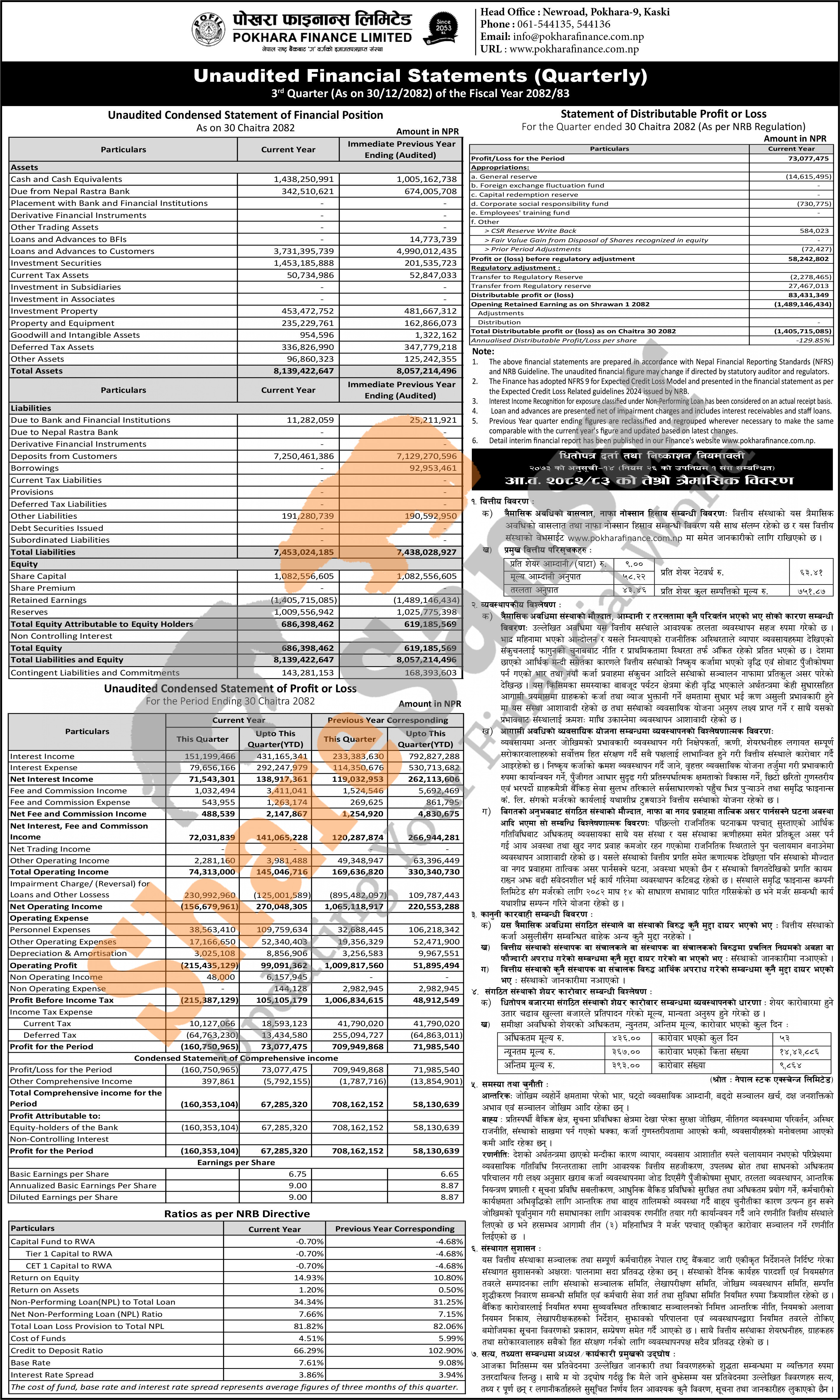 Pokhara Finance Limited has posted a net profit of Rs 73.07 million and published its 3rd quarter company analysis of the fiscal year 2082/83.