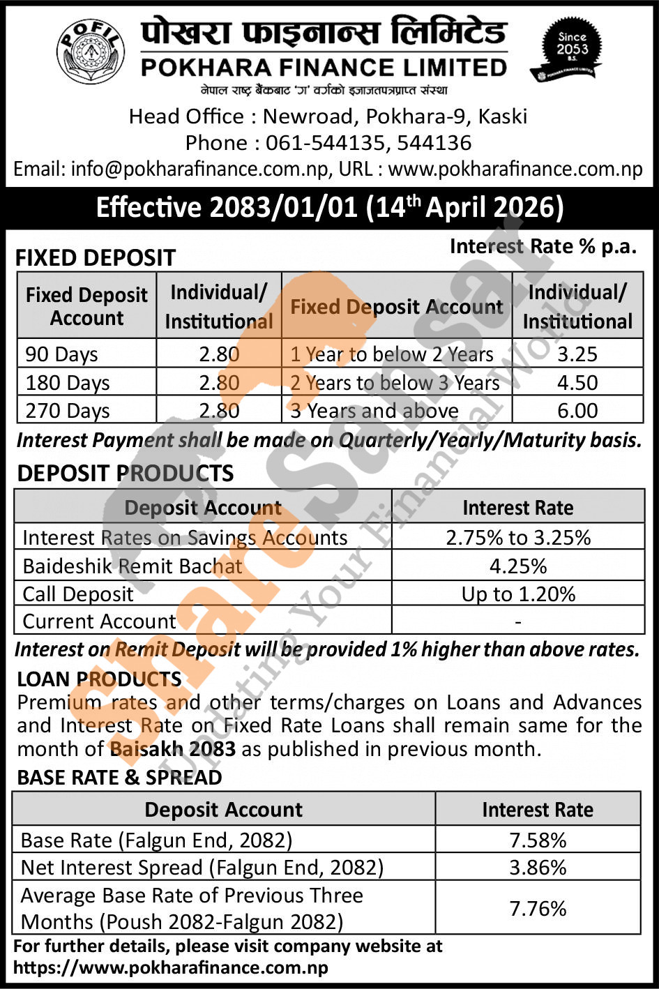 Pokhara Finance Limited has published a notice regarding the new interest rate for deposit and loan products and it's effective from 1st Baisakh, 2083.