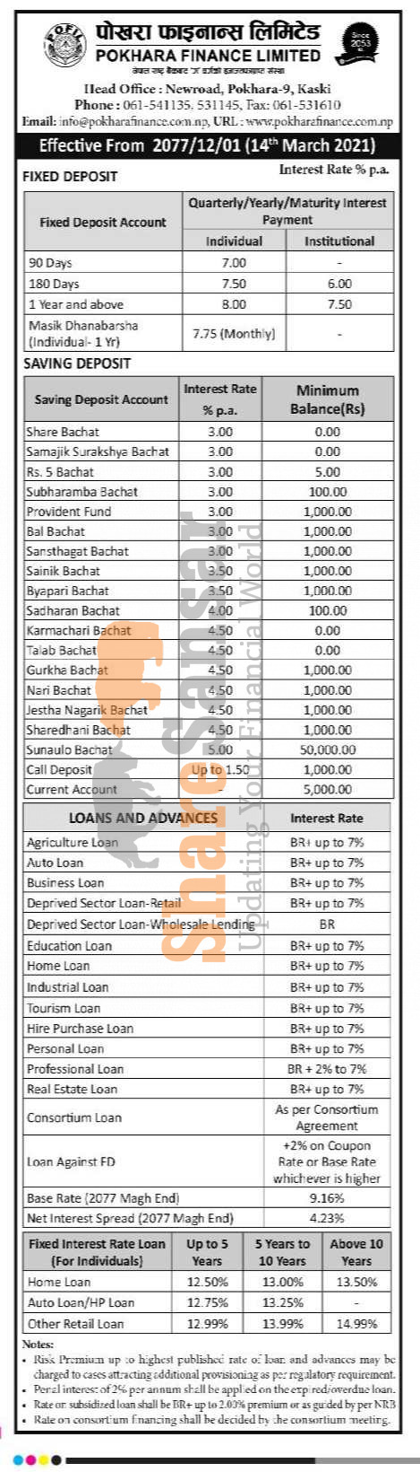 Pokhara Finance Limited has published a notice regarding the new interest rate for deposit and loan products and it's effective from 1st Chaitra, 2077.