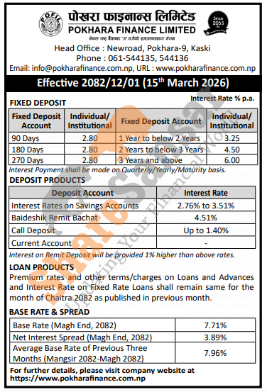 Pokhara Finance Limited has published a notice regarding the new interest rate for deposit and loan products and it's effective from 1st Chaitra, 2082.