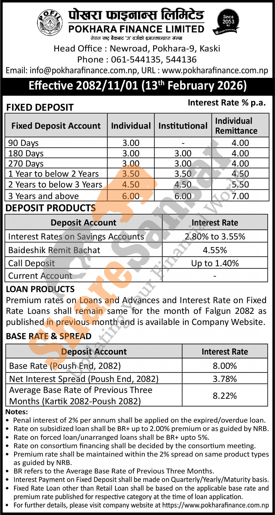 Pokhara Finance Limited has published a notice regarding the new interest rate for deposit and loan products and it's effective from 1st Falgun, 2082.
