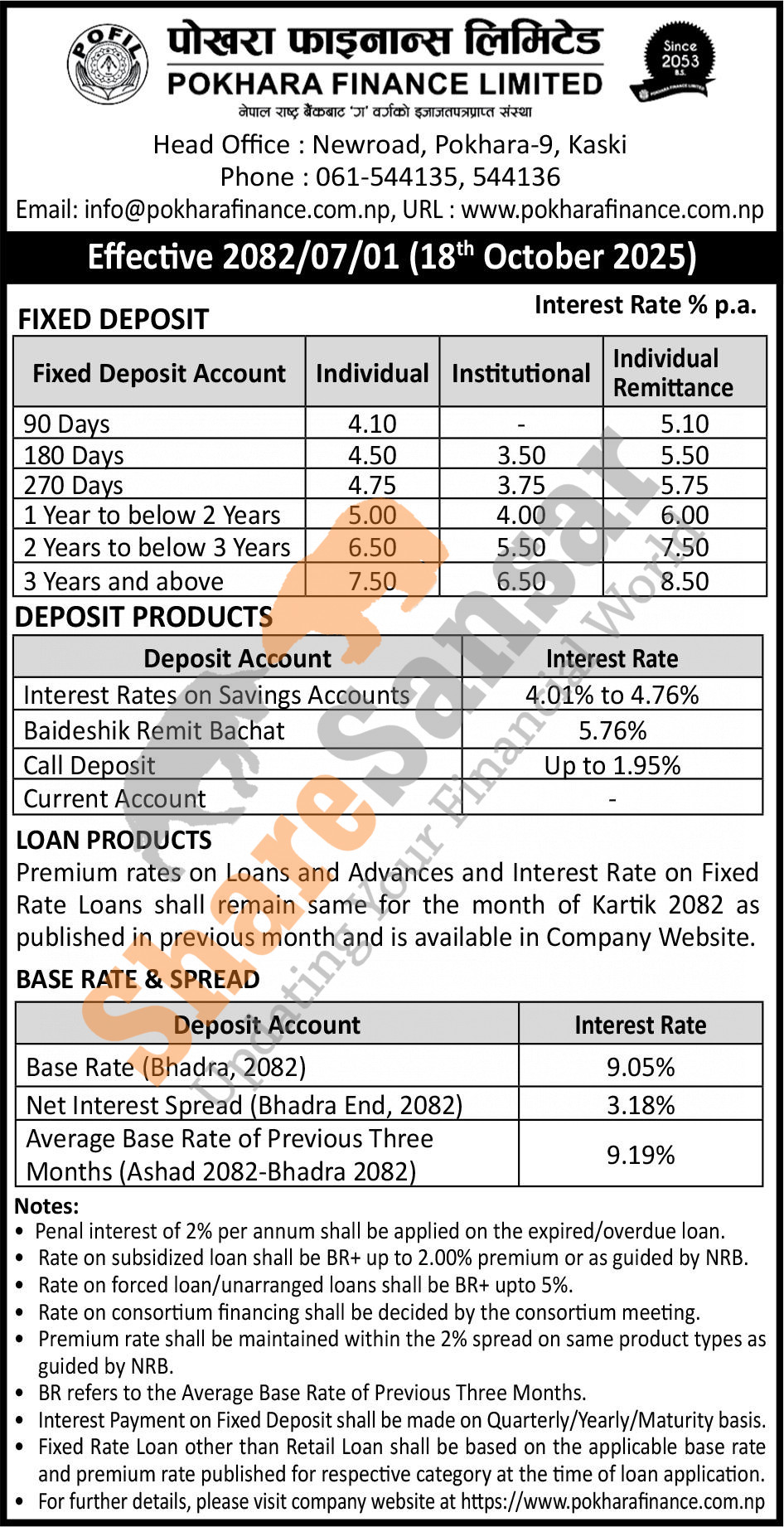 Pokhara Finance Limited has published a notice regarding the new interest rate for deposit and loan products and it's effective from 1st Kartik, 2082.