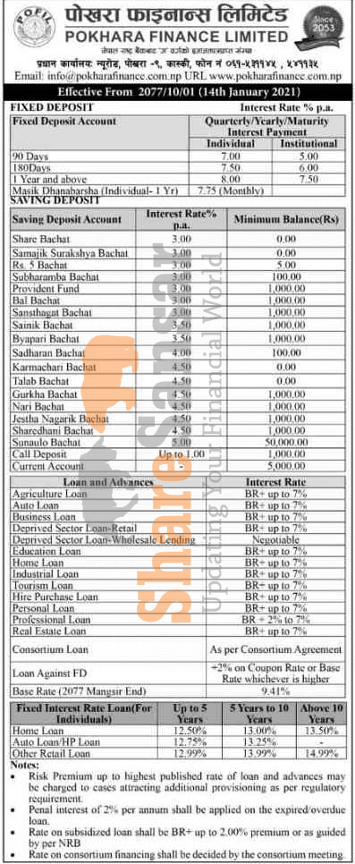 Pokhara Finance Limited has published a notice regarding the new interest rate for deposit and loan products and it's effective from 1st Magh, 2077.