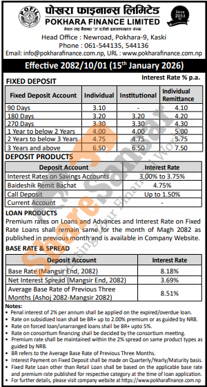 Pokhara Finance Limited has published a notice regarding the new interest rate for deposit and loan products and it's effective from 1st Magh, 2082.