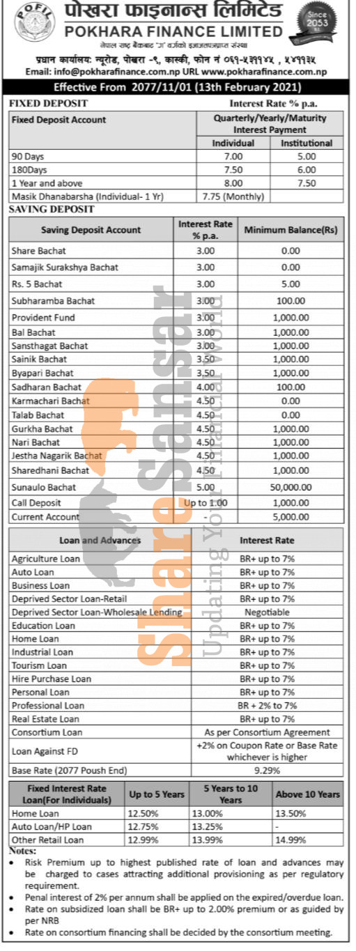 Pokhara Finance Limited has published a notice regarding the new interest rate for deposit products and it's effective from 1st Falgun, 2077.