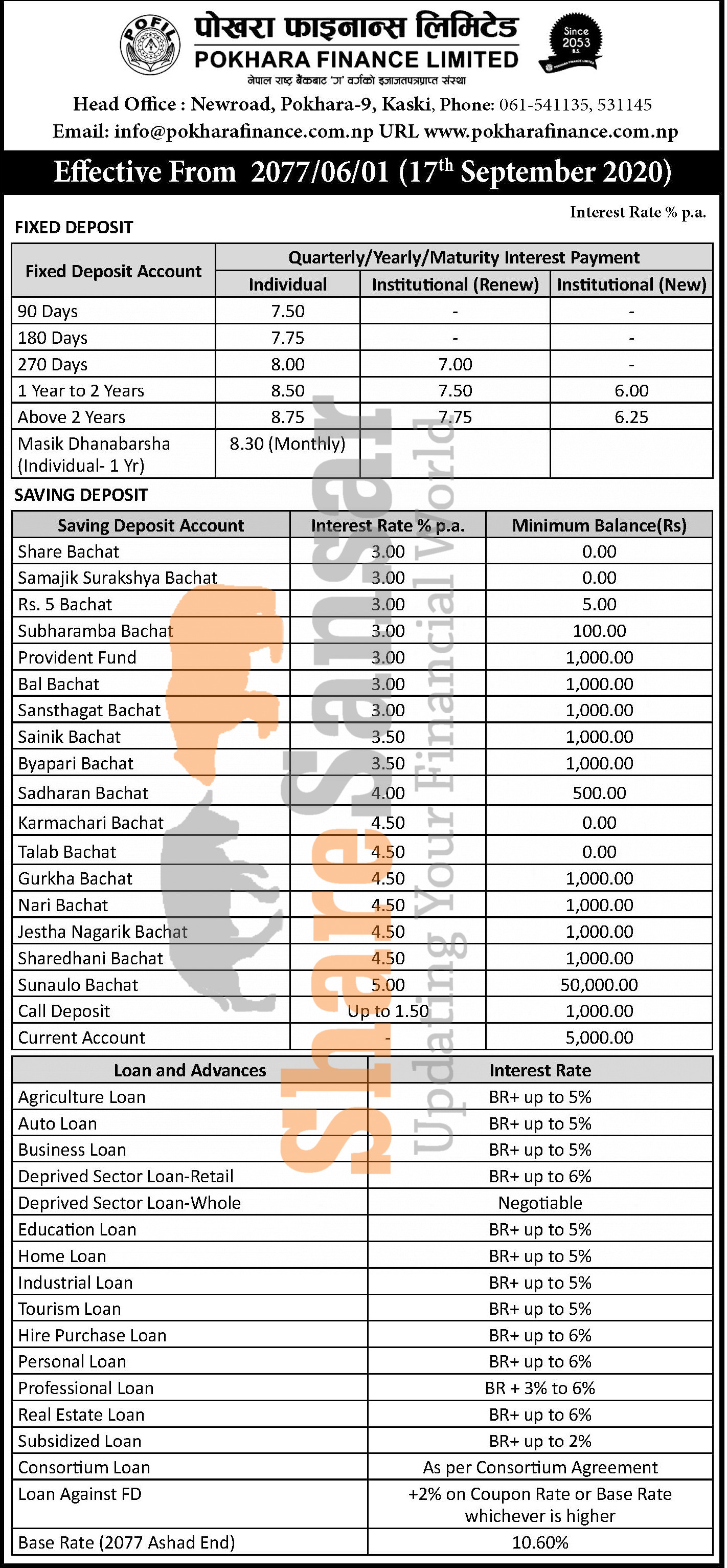 Pokhara Finance Limited has published a notice regarding the new interest rate for its deposit and loan product and its effective from 1st Ashwin, 2077.