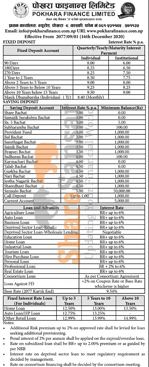 Pokhara Finance Limited has published a notice regarding the new interest rate for its deposit and loan products and it's effective from 1st Poush, 2077.