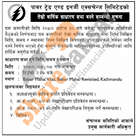 Power Trade and Energy Exchange Limited has announced its 3rd AGM going to be held on 8th Mangsir, 2080.
