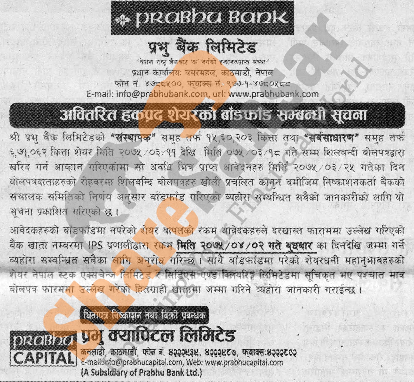 Prabhu Bank Limited has allotted its 15,60,203 units promoter share and 6,71,062 units ordinary share in auction to the general public on 25th Ashad, 2075 and refunding money to the non-allottee investors from 2nd Shrawan, 2075.