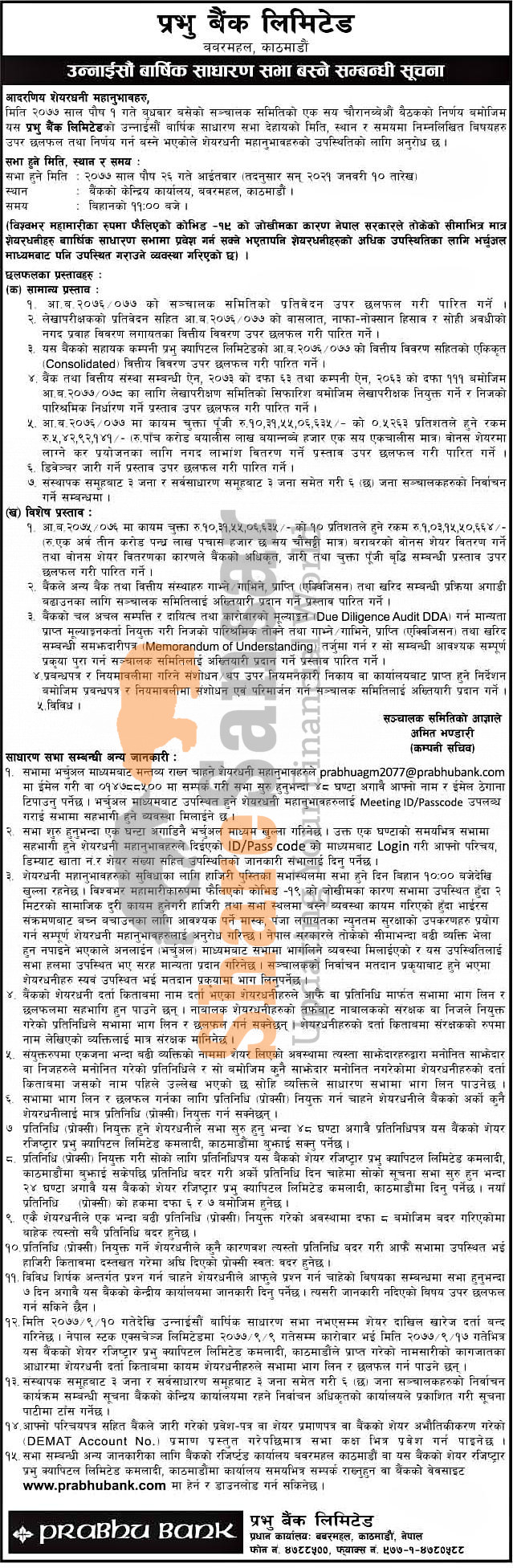 Prabhu Bank Limited has announced its 19th AGM going to be held on 26th Poush, 2077.