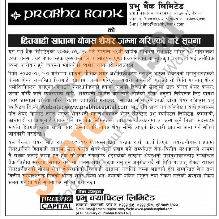 Prabhu Bank Limited has distributed 10% bonus share directly to DEMAT accounts and urged its shareholders to dematerialize their shares.
