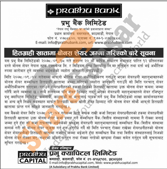 Prabhu Bank Limited has distributed 12% bonus share directly to DEMAT accounts and urged its shareholders to dematerialize their shares.