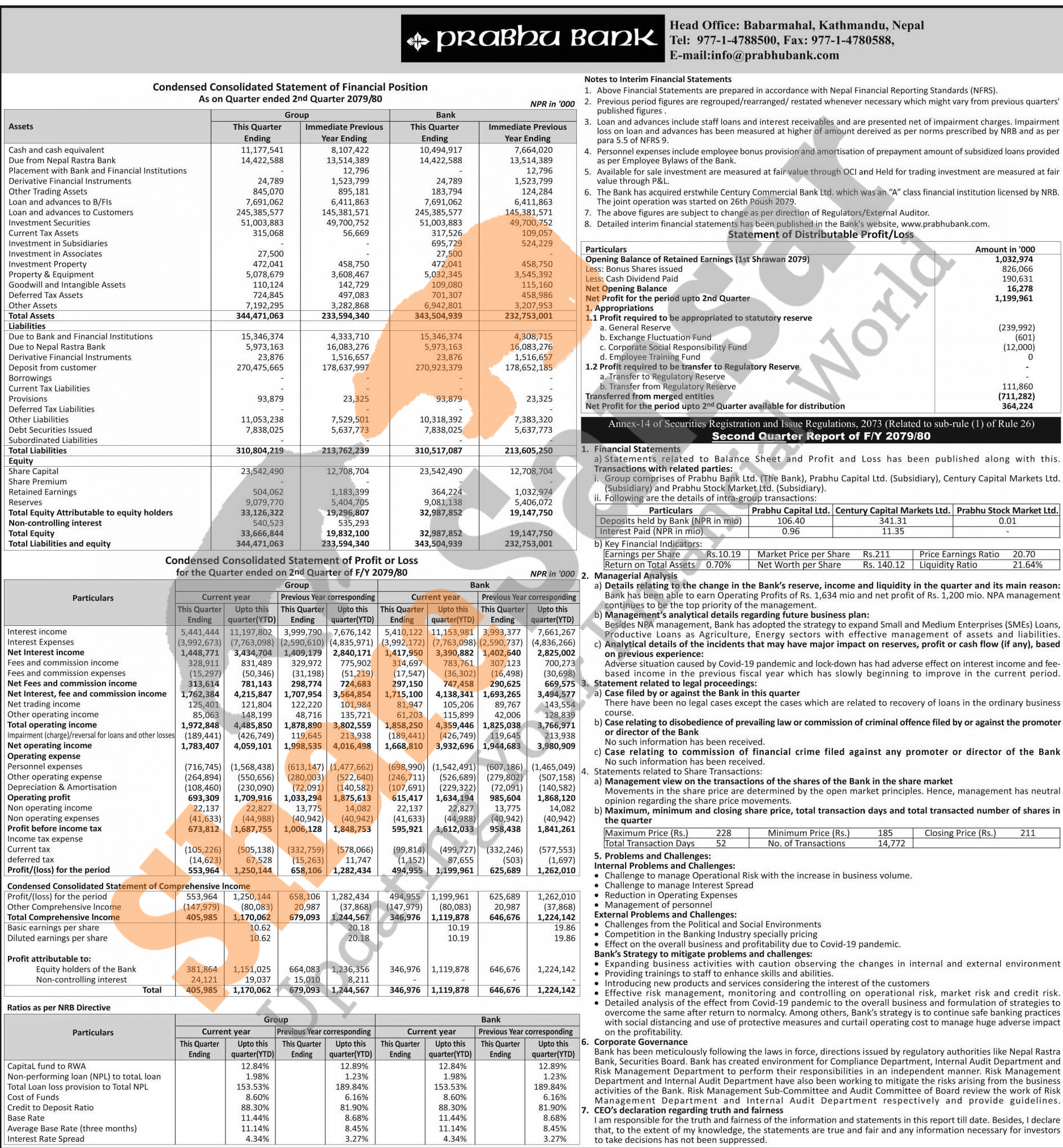 Prabhu Bank Limited has posted a net profit of Rs 1.19 billion and published its 2nd quarter company analysis of the fiscal year 2079/80.