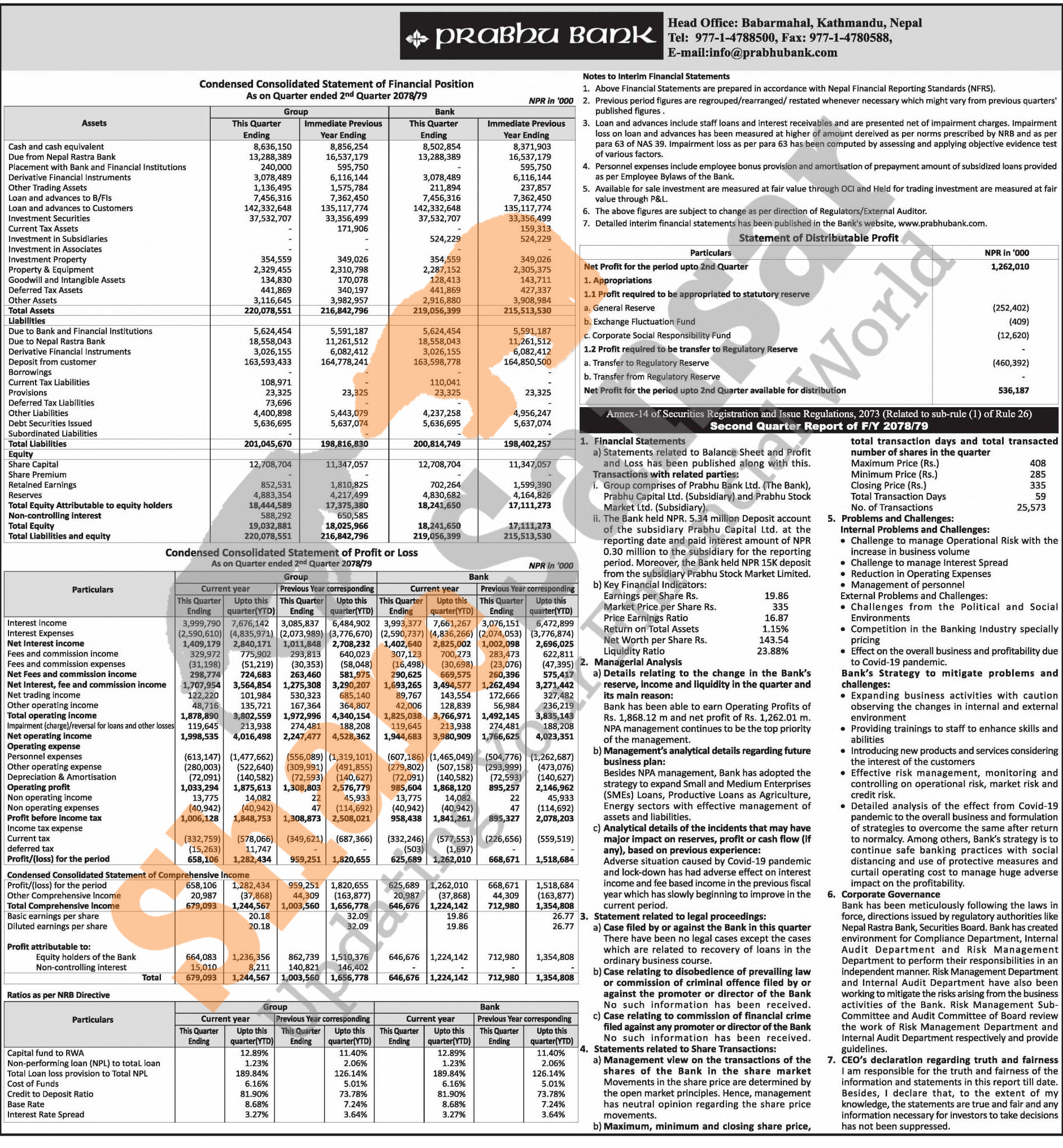Prabhu Bank Limited has posted a net profit of Rs 1.26 billion and published its 2nd quarter company analysis of the fiscal year 2078/79.