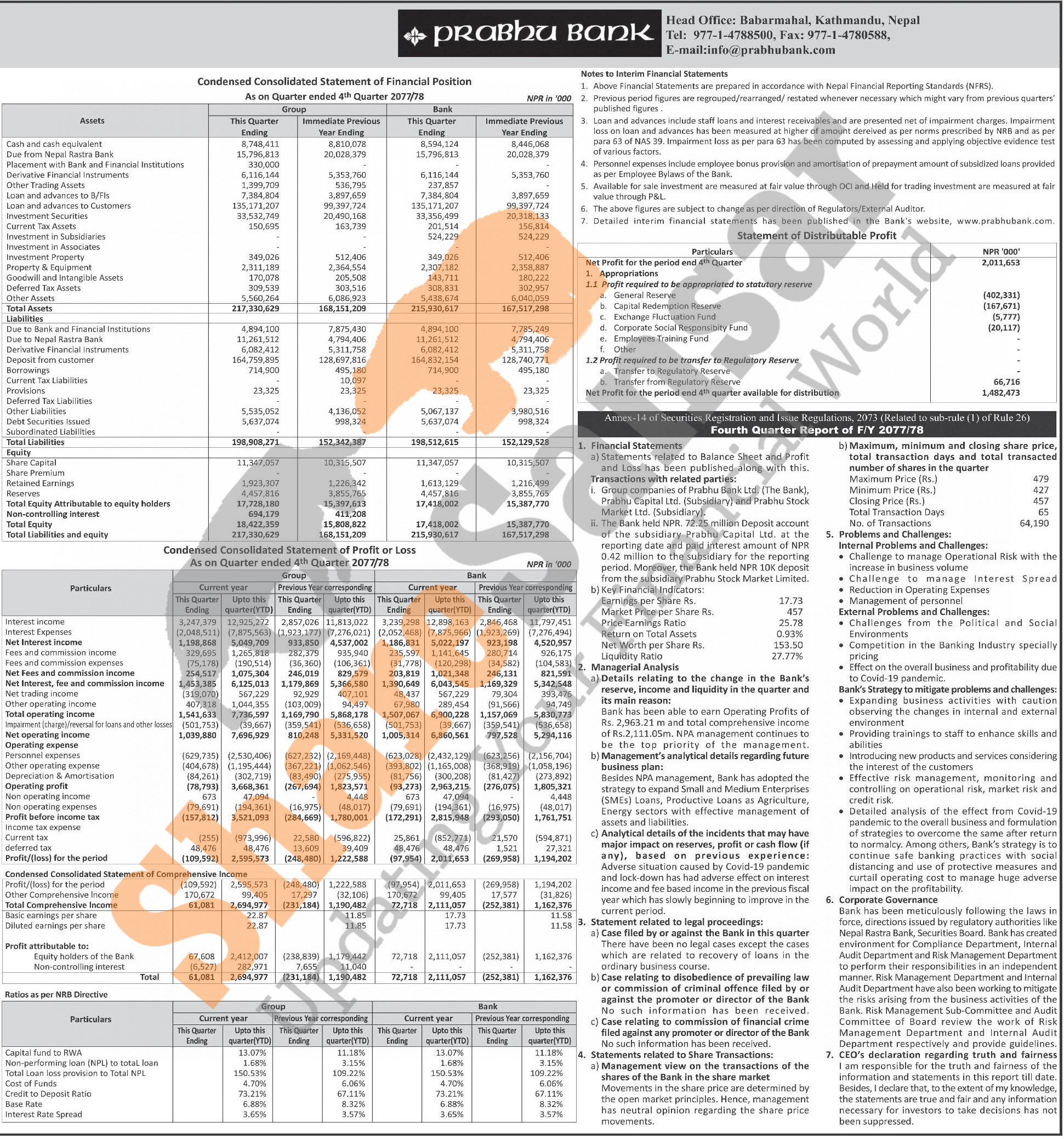 Prabhu Bank Limited has posted a net profit of Rs 2.01 billion and published its 4th quarter company analysis of the fiscal year 2077/78.