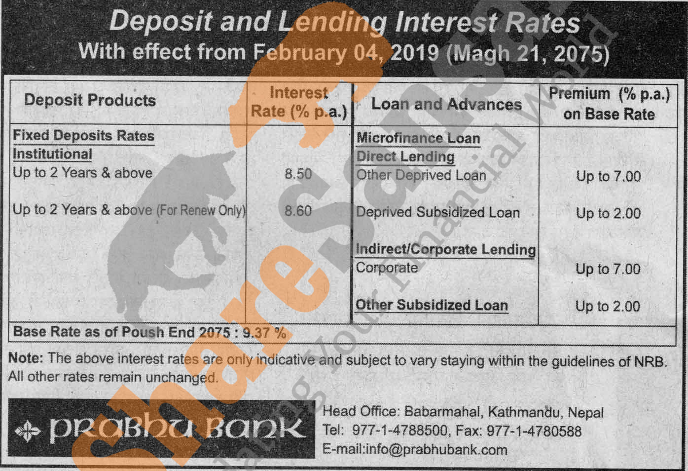 Prabhu Bank Limited has published a notice regarding new interest rate and its effective from 21st Magh, 2075.