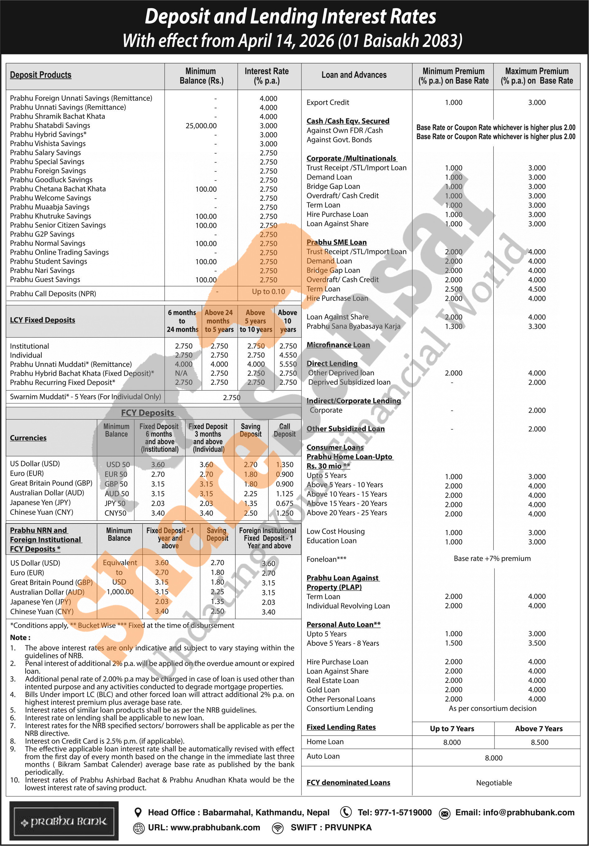 Prabhu Bank Limited has published a notice regarding the new interest rate for deposit and loan products and it's effective from 1st Baisakh, 2083.