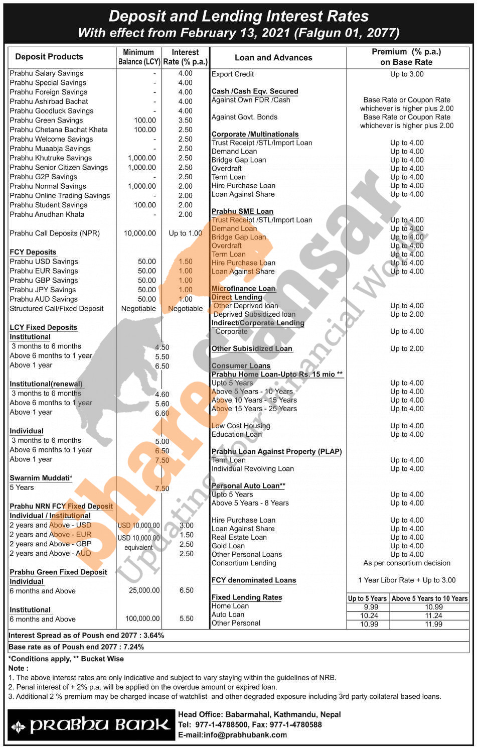 Prabhu Bank Limited has published a notice regarding the new interest rate for deposit and loan products and it's effective from 1st Falgun, 2077.