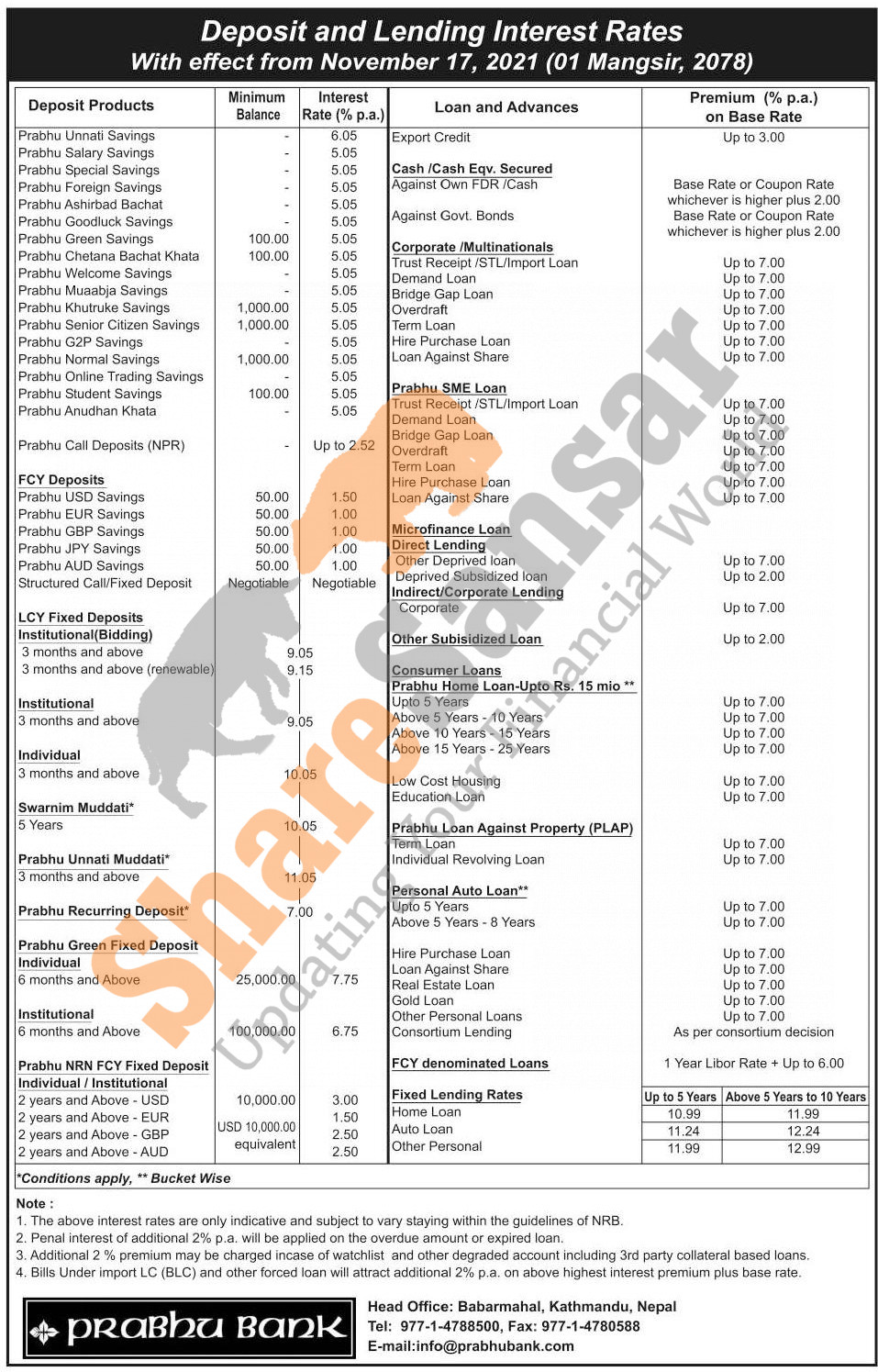 Prabhu Bank Limited has published a notice regarding the new interest rate for its deposit and loan products and it's effective from 1st Mangshir, 2078.