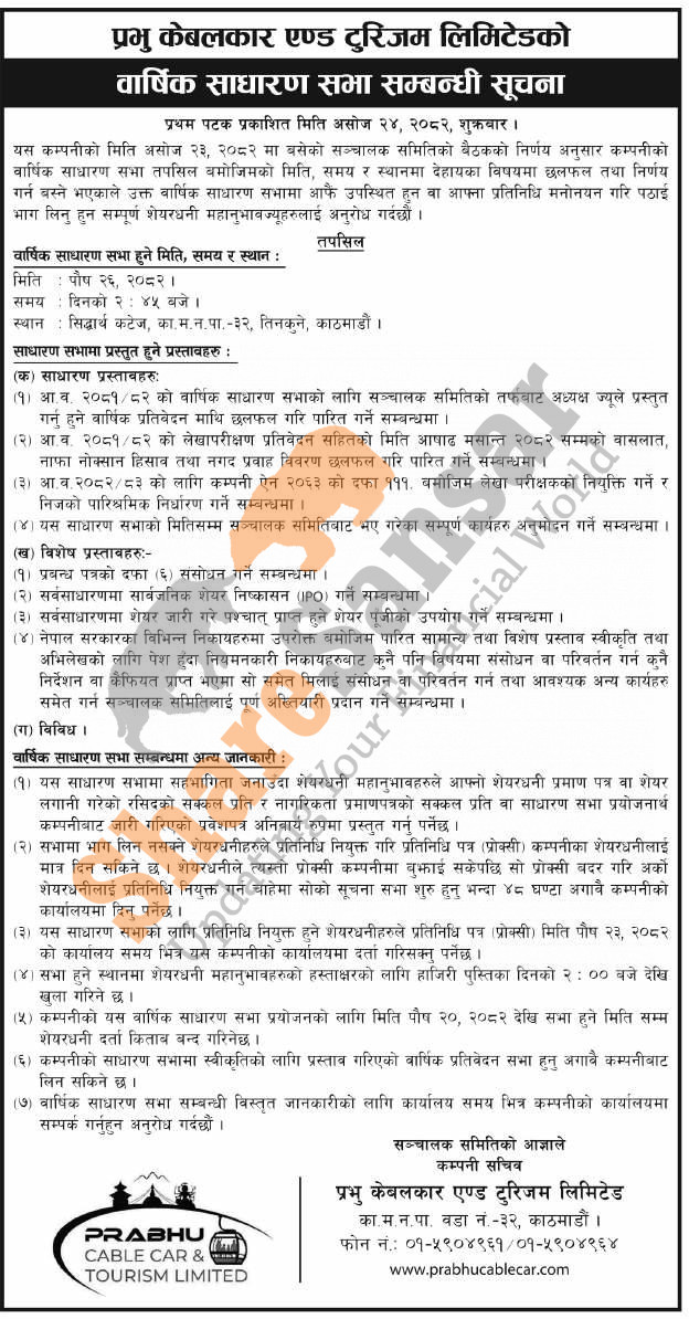 Prabhu Cable Car & Tourism Limited has announced its AGM going to be held on 26th Poush, 2082.